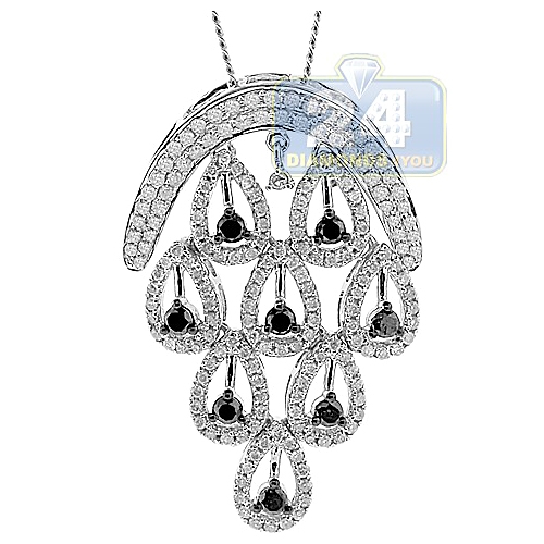 This gorgeous diamond chandelier pendant features cascading teardrop links dangling from a half circle. Artfully produced from solid 14k white gold, it has precisely polished ultra shiny finish. The dangling pendant is set with icy white and black round-shaped natural diamonds, all totaling 1.32 carat. Our women's diamond pendant measures 34 x 22 mm. The piece of jewelry will satisfy any fashion craving!