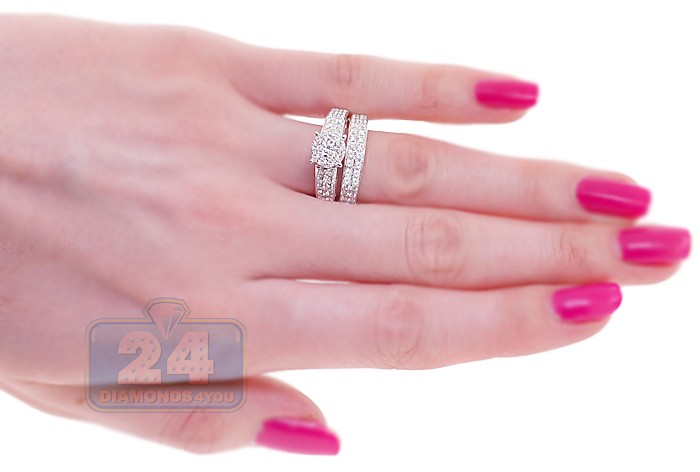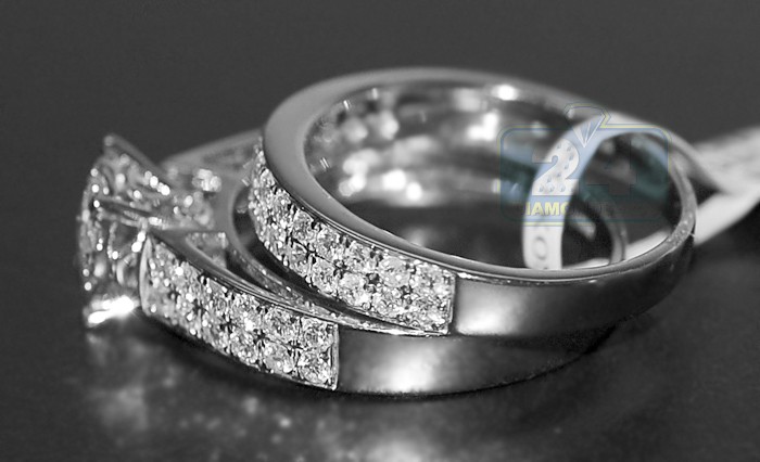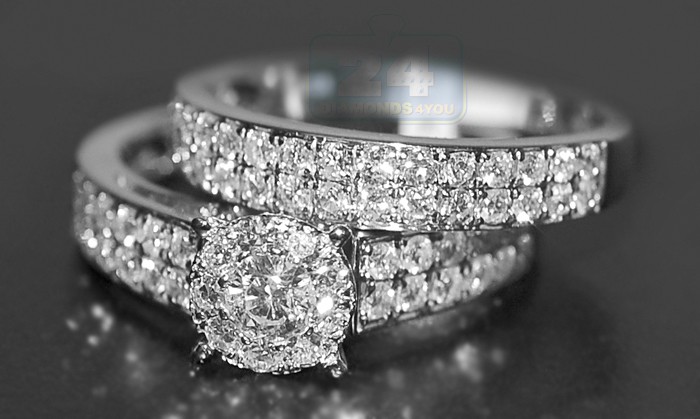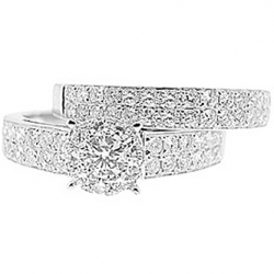 Affordably priced and handmade of genuine materials, our dazzling bridal set of rings is a great investment! It is professionally crafted in lustrous 14k white gold with shiny polished finish, and features icy white and eye clean genuine diamonds totaling 1.37 carat. The engagement ring has a fancy designed crown that holds a round cut center stone surrounded by a row of smaller diamonds for the solid and enlarged effect. Each shinning side of the shank features shimmering round cut brilliants as well. A perfectly matched wedding band is handset with genuine stones as well and makes a great addition to the engagement ring.
