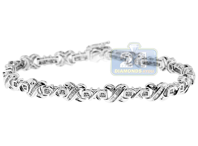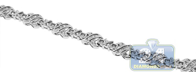 Get tons of compliments wearing our X shape link bracelet! Professionally crafted in lustrous 14 karat white gold, it features high-polished smooth finish. The links are channel set with gleaming white baguette-cut (0.50 carat) and round brilliant-cut (0.90 carat) genuine diamonds, SI1-SI2 clarity, G-H color. This women's wrist bracelet has length of 7 inches and width of 7 mm. Timeless design for special occasions!