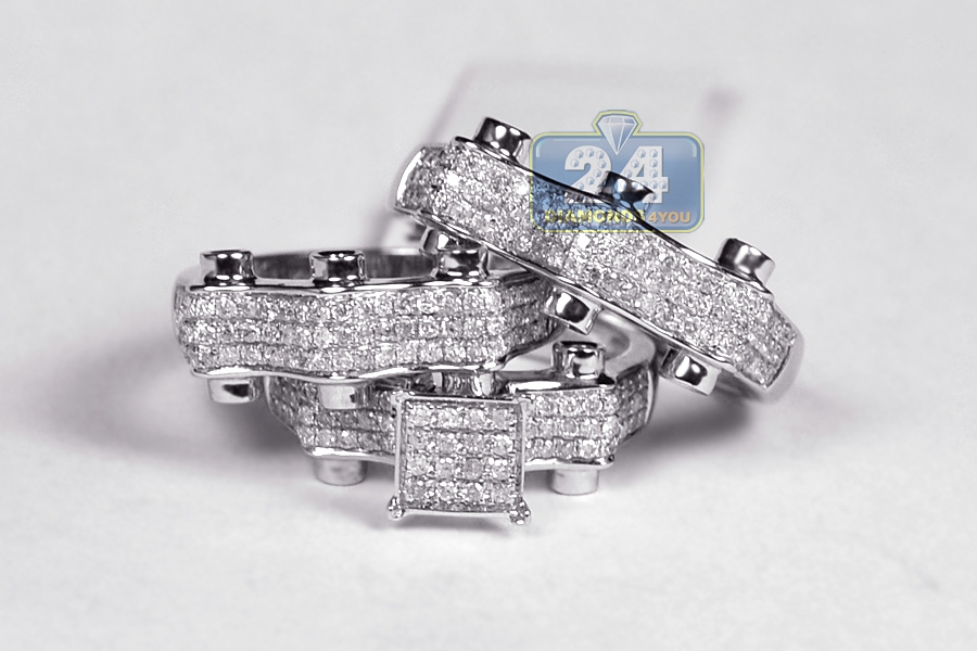 Absolutely stunning and modern design of this diamond bridal set will make your special day successful! Our gorgeous set features men's wedding band, women's engagement and wedding rings. All three of them are perfectly designed to make a splendid match; three rows of stones on each of the rings are adding a timeless feel... The rings are handmade of cool 14k white gold, finished with a high polish, and handset with eye clean white round cut diamonds with the total weight of 1.43 carat. Each stone has SI2 clarity, G-H color which makes all of them eye clean and sparkling. Enjoy the fabulous look and feel with these jewels of love!
