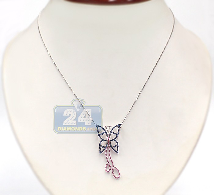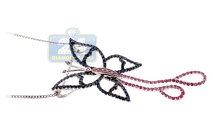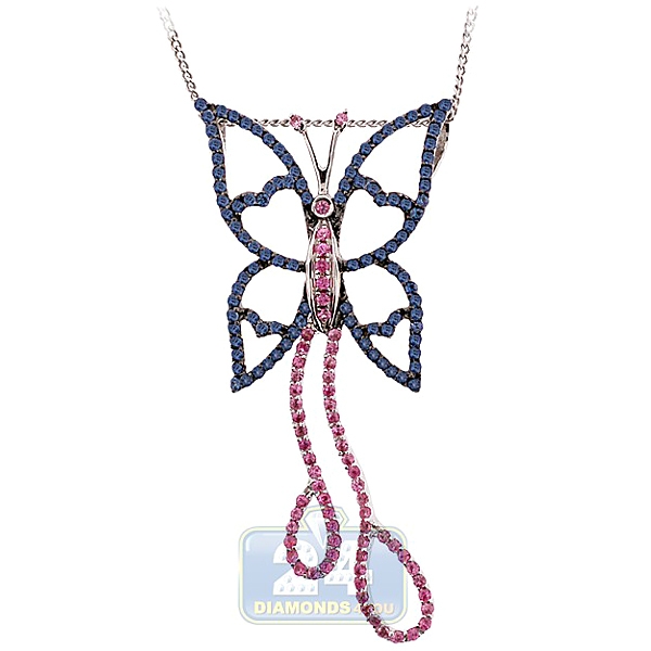 Featuring the delightful shape of a butterfly, our women's gemstone pendant is artfully handmade of solid 14 karat white gold with highly polished shiny finish. The butterfly pendant is studded with 1.44 carat of natural pink and blue round-cut sapphires. The piece of jewelry measures 47 mm in total length and 23 mm in width. This is a truly fabulous gemstone pendant to add to your jewelry collection!