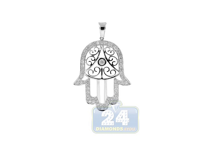 The unique shape of Hamsa Hand, also known as the Hand of Miriam, comes in our diamond filigree pendant! Skillfully handmade of cool 14k white gold, it's high-polished for ultra sparkling finish. The Hamsa pendant is encrusted with gleaming white round brilliant-cut natural diamonds of 1.44 carat, SI1-SI2 clarity and G-H color. The piece measures 47 mm in hanging length, and hand itself is 38 x 33 mm. This men's diamond pendant is thought to offer protection from the evil eye!