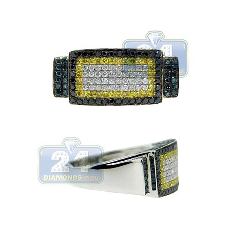 14K White Gold 1.46 ct White Blue Yellow Diamond Mens Ring