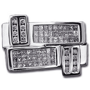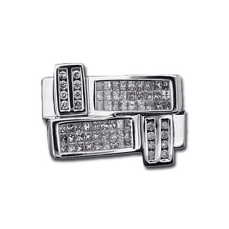 Cool and handsome, our modern style signet is a perfect accessory for today's man! It is skillfully designed in cool 14k white gold with shiny polished finish, and features two vertically placed on each side rows of genuine round cut diamonds as well as two horizontal rectangles of invisibly set princess cut diamonds. All brilliants are absolutely natural, sparkling and eye clean, with SI1-SI2 clarity and G-H color, and weighting 1.50 carat in total.