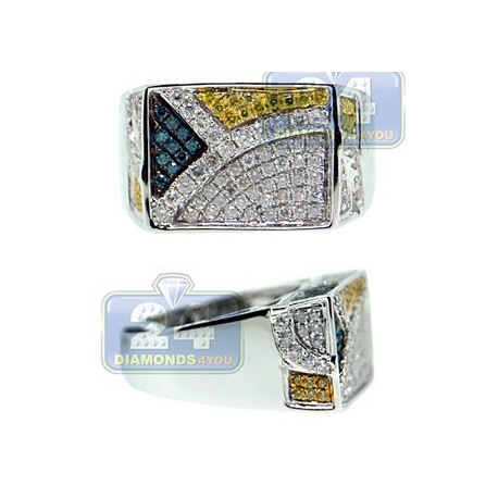14K Gold 1.55 ct White Blue Yellow Diamond Mens Rectangle Ring