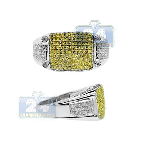 Are you ready for this extravaganza? Sunny yellow diamonds are beautifully brightening up this men's jewelry piece! The rectangular shaped setting is skillfully handmade of cool 14k white gold with perfectly polished finish. Genuine white diamonds are stylishly handset on sides of the ring as well as four larger brilliants on the top and front's bottom. All precious stones are weighting 1.55 carat in total. What a truly unordinary look!