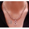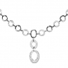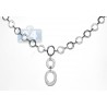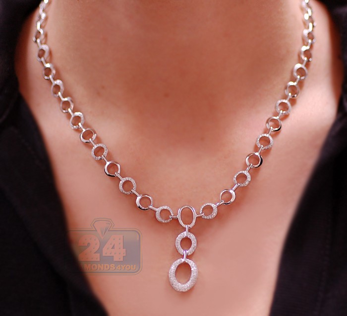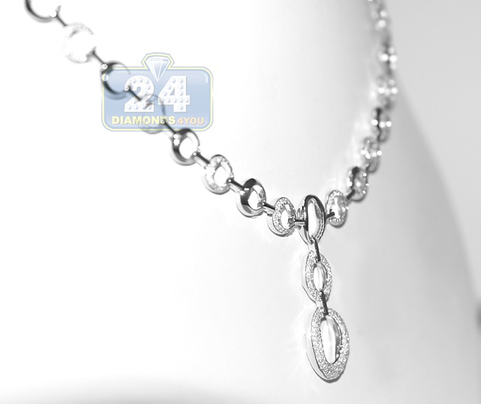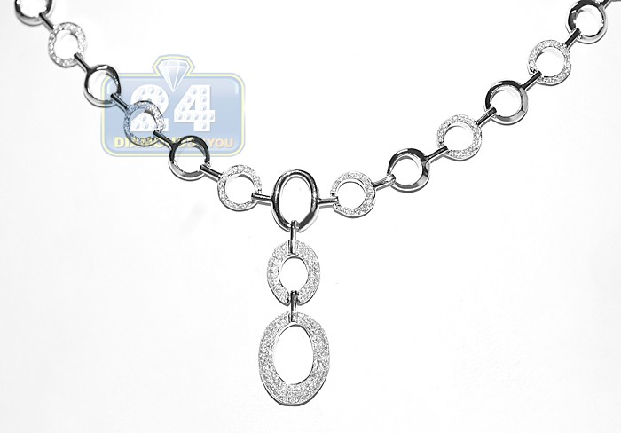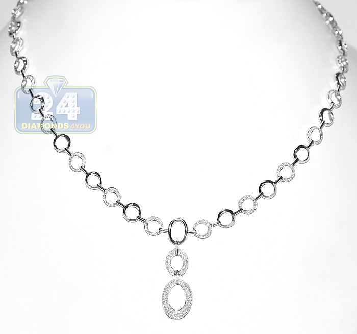 Elegant design of our diamond lariat necklace features round and oval shaped open links. The alternating pattern continues down from the center to create a dangling piece to adorn your neck! It's professionally made of cool 14k white gold, and precisely polished for shiny look. This women's diamond necklace has 17 inches in length around the neck with dangling part of 1 1/8 inches. The exquisite diamond lariat necklace will lend your evening look a touch of elegancy and charm!