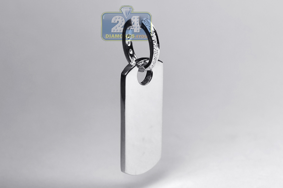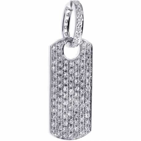 Our diamond dog tag pendant shows a sparkling side of luxury! It's masterly created from cool 14k white gold, and highly polished for very smooth touch. It's encrusted with 1.79 carat of icy white round brilliant-cut genuine diamonds. The jewelry features total length of 39 mm (without bail 29 mm) and width of 13 mm. The bail suits a 6 mm necklace. This men's id-style charm will look simply sublime on the neckline!