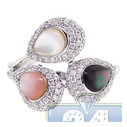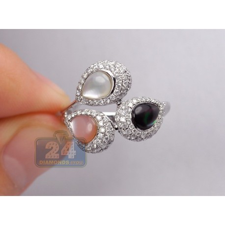 Absolutely gorgeous and totally unique! Our cocktail ring is artfully handcrafted in cool 14k white gold with perfectly polished finish, beautifully amazed with three natural multi colored opals as well as icy white diamonds on each side. Each brilliant features SI1-SI2 clarity with G-H color. What a special addition to your daily look!