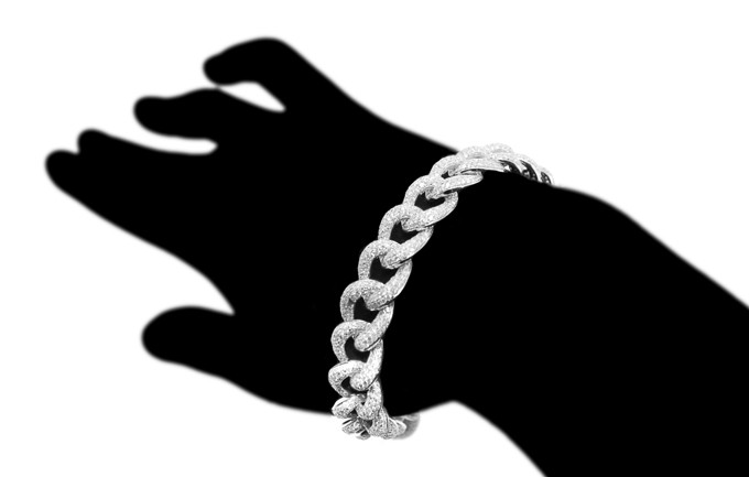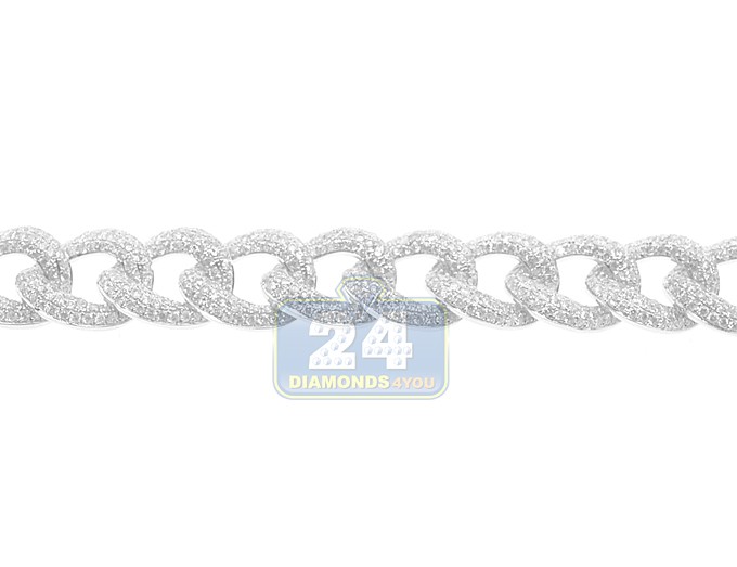 A river of diamonds shimmers through on this elegant curb link bracelet! Artfully crafted in solid 14 karat white gold, it features highly polished smooth finish. Our men's cuban bracelet is paved with 11.73 carats of icy white round brilliant-cut genuine diamonds. The piece measures 8.5 inches in length and 12 mm in width. Illuminate your wrist with royal beauty!