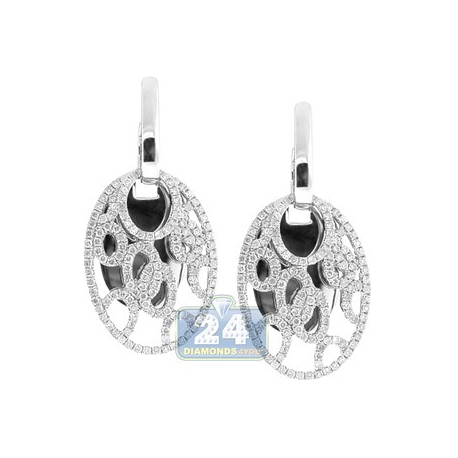 Designed with style and elegance, these gorgeous earrings feature an openwork pattern perfectly matched with high polished oval discs. The pair is expertly handcrafted in gleaming 14k white gold and pave set with genuine sparkling diamonds. These brilliants are absolutely eye clean, with G-H color and SI1-SI2 clarity. If you are looking for a nice dangles to match with your daily or formal outfit, this would be the one!