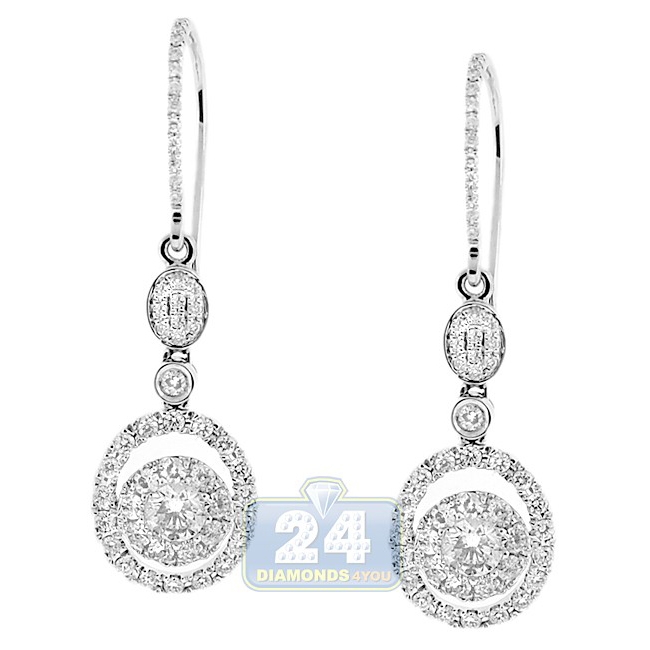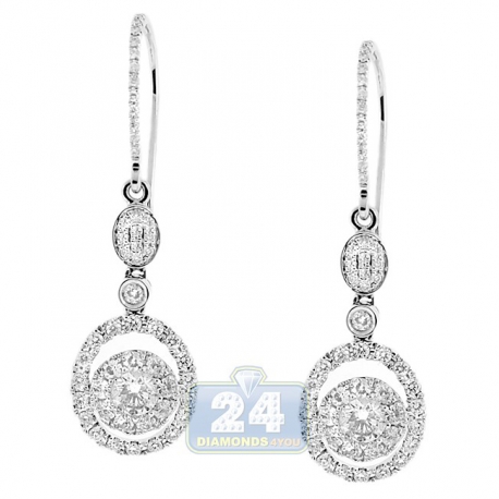 The dazzling fire of diamonds and unique dangling design create these breathtaking earrings. Dangling from a glittering diamond hook, the eye-catching round-shaped setting features a circle design set with icy white round cut diamonds. The center piece of the earring is adorned with large round cut stone surrounded by a row of smaller diamonds. All twinkling stones total to 1.36 ct. This magnificent jewelry piece is crafted in 14k white gold and will make as a perfect addition to your outfit for a day on the town or an evening out.