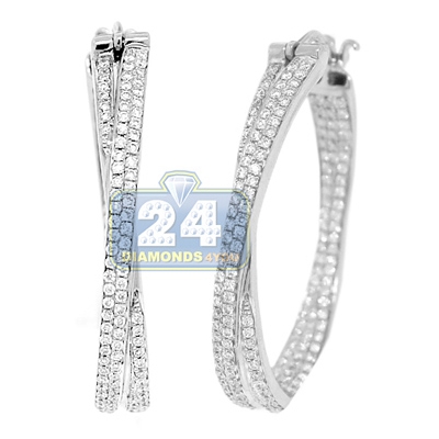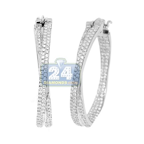 Dazzling and striking, these X-shape hoop earrings feature a galaxy of icy white round brilliant-cut genuine diamonds of 1.42 carats (VS1-VS2, F-G). Diamonds are set inside and out. They're professionally produced from cool 14 karat white gold, and high-polished for smooth feel. Our women's diamond hoops have height of 38 mm and width of 5 mm. Secure backing and a luxurious captivating look!