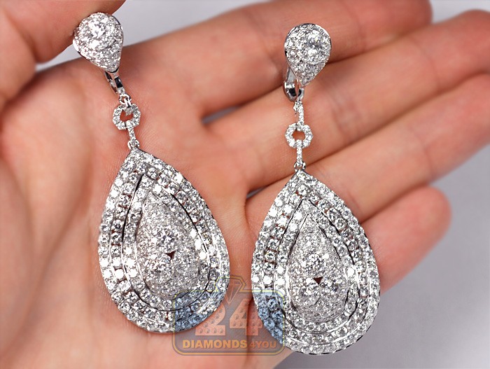 These shimmering diamond dangle earrings will glitz up every look! The jewelry piece is handmade of lustrous 14k white gold, and accented with heap of icy white round-cut diamonds totaling 15.02 carats. Here's the lush, rich pair of diamond earrings you have been longing to find, so go ahead and splurge!