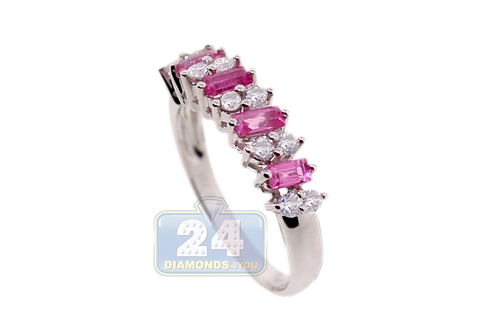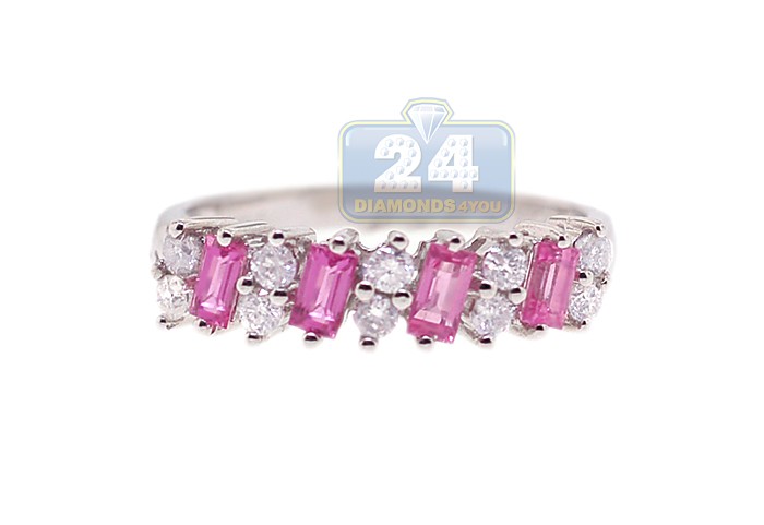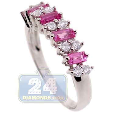 Our fabulous ring is just a gorgeous mix of colors and genuine materials! It showcases a center row of icy white round cut diamonds and romantic pink baguette shaped sapphires. The setting is expertly handcrafted in cool 14k white gold with highly polished shiny finish. What a pure feminine beauty!