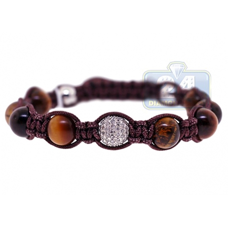 Interesting and timeless, this diamond tiger eye bead bracelet is a piece you're looking for! It has 5 metal beads professionally created from cool 14k white gold, and high-polished for shimmering smooth finish. One of them is encrusted with lustrous white round brilliant-cut real diamonds weighting 2.00 carats (SI1-SI2 clarity, G-H color). There're also eight natural tiger eye balls connected by original brown macrame. Comfortable pull closure makes this gemstone bead bracelet easy on and off. Add this luxurious diamond bracelet to your collection!