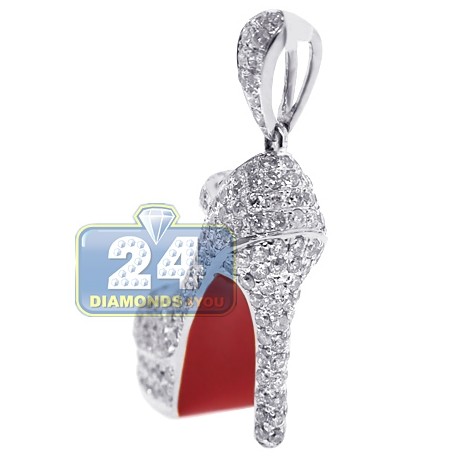 Our high heel shoe pendant is a timeless piece of jewelry that will never go out of style! It's masterly produced from cool 14k white gold, and high-polished for very smooth shiny finish. It also features a unique red enameled sole. This high heel shoe is studded with icy white round brilliant-cut natural diamonds, all totaling 2.02 carats. It has the following measurements: 31 x 20 x 10 mm. Make a fashion statement with our women's shoe pendant!
