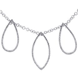 This teardrop and marquise shaped links are creating an alluring drop effect on this women's diamond necklace! Skillfully produced from solid 14 karat white gold, it has highly polished shimmering finish. The links are encrusted with 2.18 carats of gleaming white round brilliant-cut genuine diamonds, SI1-SI2 clarity and G-H color. The diamond link necklace measures 17 inches in length around the neck, and width of the links varies from 11 to 32 mm which suspended from the chain of 2.5 mm. Our splendid diamond necklace is a perfect addition to your evening gown or elegant outfit for the special night out!
