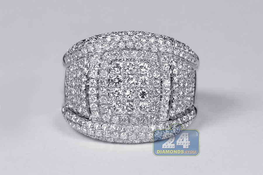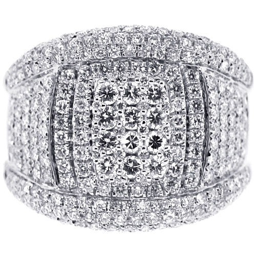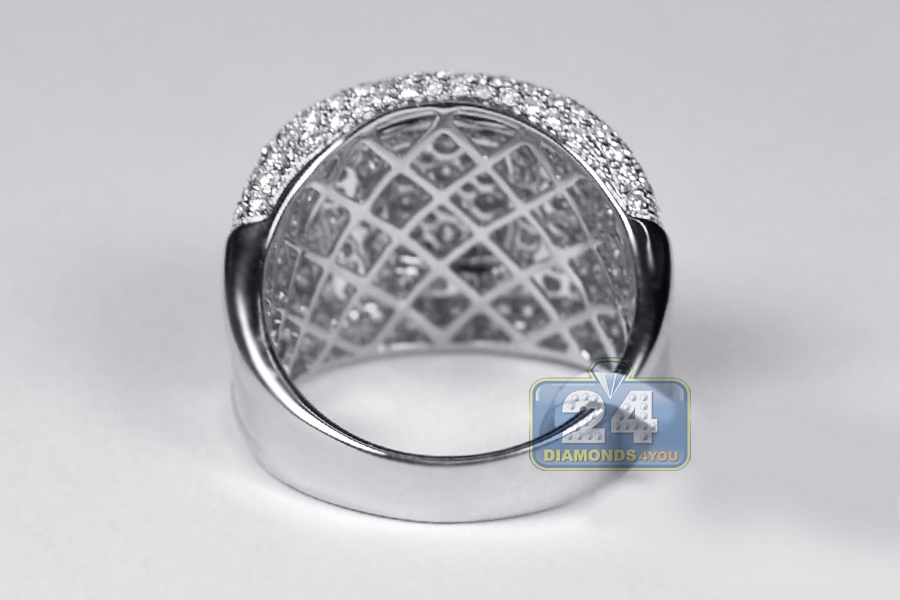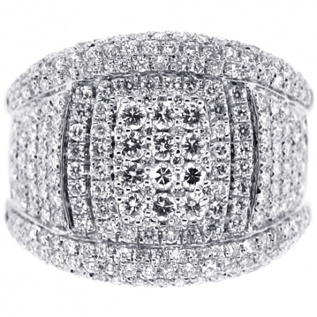 Walk in wearing our elegant diamond band ring, and all eyes will be on you! It's masterly created from cool 14k white gold, and highly polished for sparkling smooth touch. It's encrusted with icy white round brilliant-cut natural diamonds totaling 2.34 carats. Width of the piece varies from 19 to 5 mm. This men's diamond ring gleams from every angle!