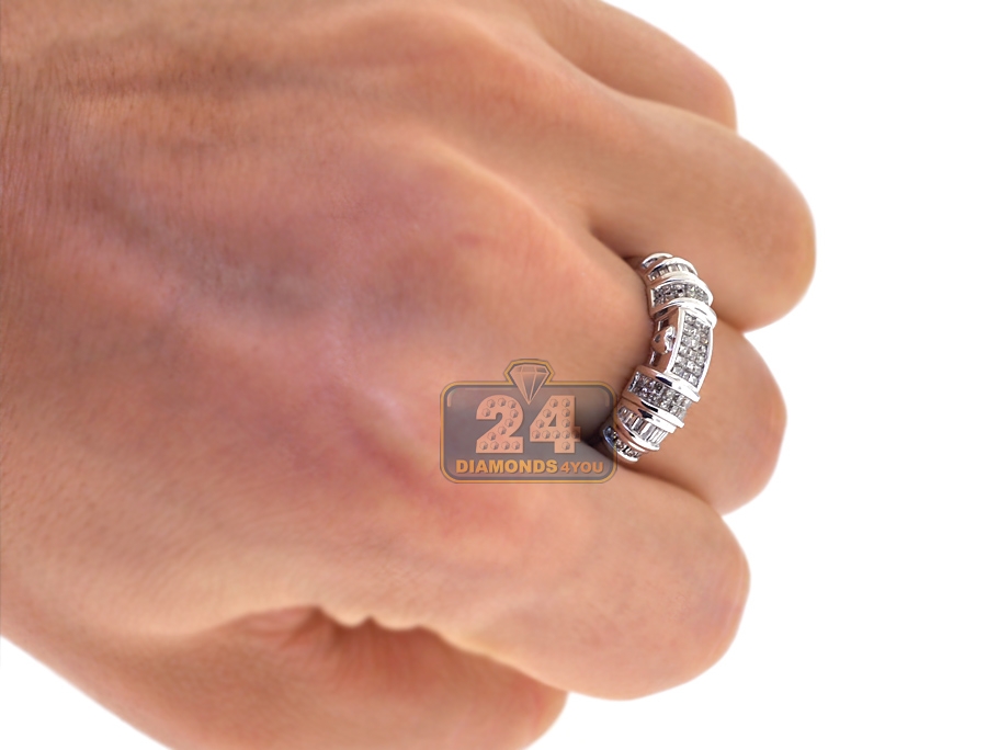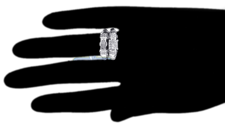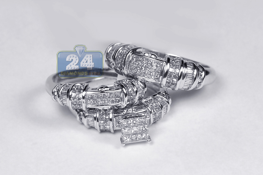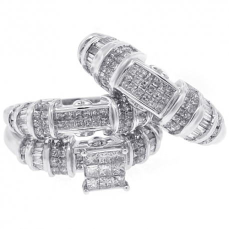 Celebrate your love with our magnificent diamond wedding three ring set! It features an engagement ring, men's and women's wedding bands. They are masterly produced from lustrous 14k white gold, and studded with 2.63 carats of white round brilliant-, baguette-, princess-cut genuine diamonds. These unique bridal rings are thoughtful symbols of your romance!