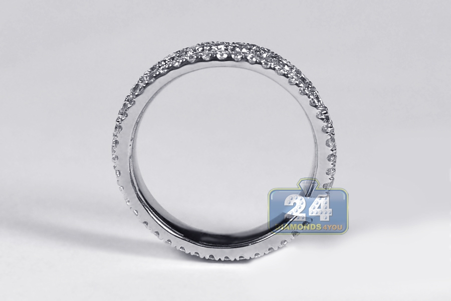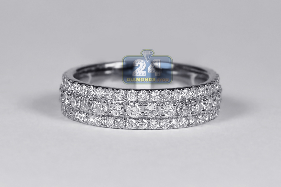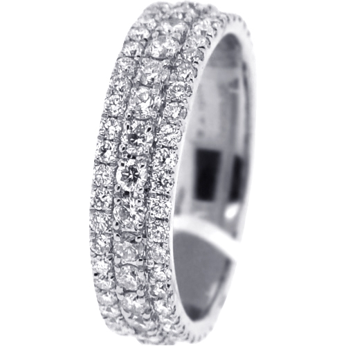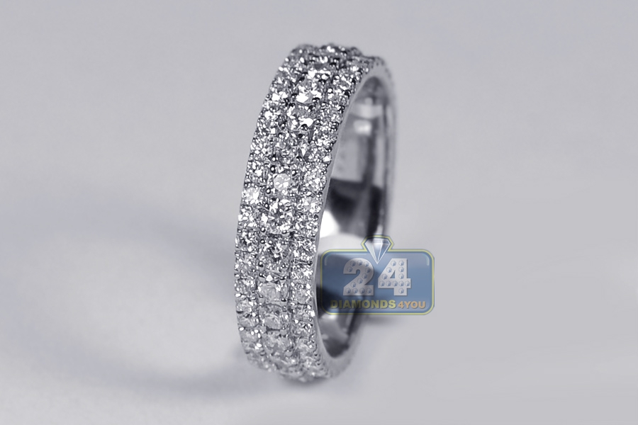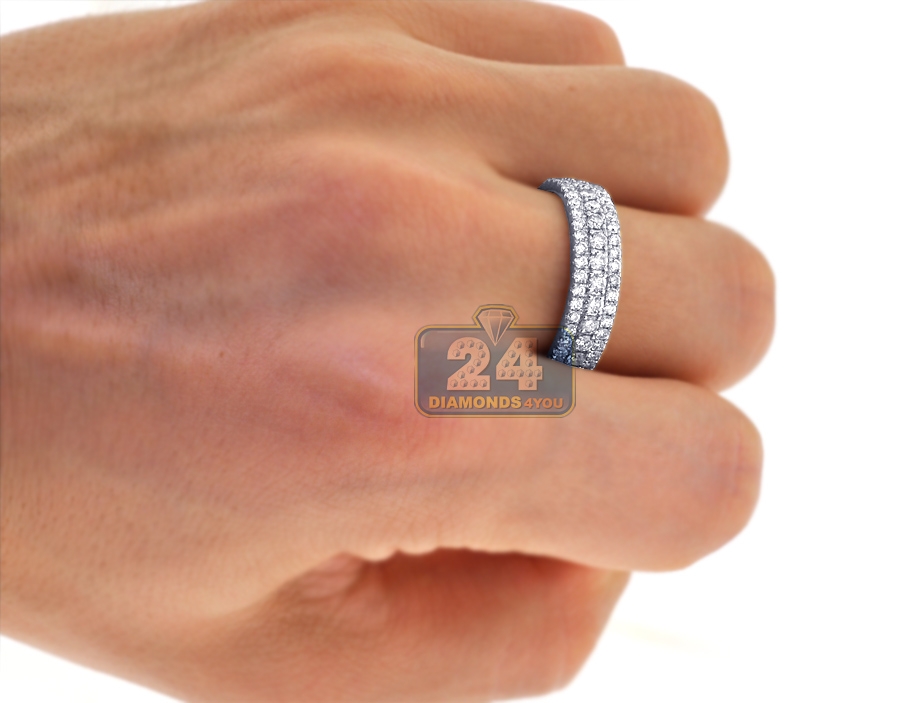 Celebrate your love or just showcase an elegant style with our diamond eternity band ring! Expertly crafted in cool 14k white gold, it has high-polished lustrous finish. This men's diamond band has width of 6 mm, and features 3 rows of icy white round brilliant-cut natural diamonds totaling 2.65 carats. Original finger size is 9 but can be custom-made in any size. Handsome mens wedding ring will add a touch of sophistication to any look!