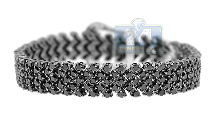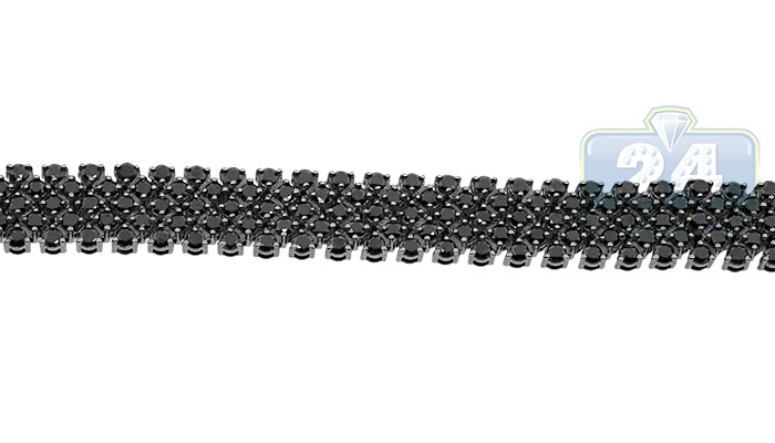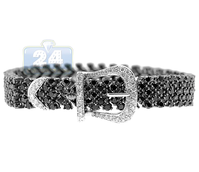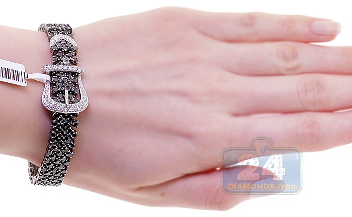Buckle up for a fancy style. Endless shine comes from approximately 20.00 carats of mysterious black and icy white round cut natural diamonds paved in this buckle bracelet. A fashionable design features 14k white gold bracelet covered with black rhodium coating and set with stunning black diamonds. Icy white, sparkling diamonds are set along the buckle clasp. Our women's diamond bracelet measures 7 inches in length and 12 mm in width. Add an enigmatic style to your look.