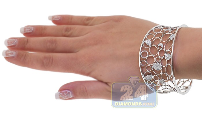 This is a showpiece - brilliant and unbelievably sparkling! Illuminate your wrist in this charming diamond cuff bracelet artfully handcrafted in 14 karat white gold with highly polished smooth finish. Magnificent scrollwork in circles designed to make this piece of jewelry stunning! It's rich with icy white round brilliant-cut natural diamonds totaling 2.05 carats. Our women's diamond bracelet has length of 8 inches and width of 1.5 inch. This cuff bracelet will become your favorite!