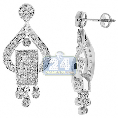 Adorn yourself with this amazing vintage style diamond earrings! They have unique dangle design, artfully crafted in cool 14 karat white gold with polished smooth finish. Our women's drop earrings decorated with 2.05 carats of icy white round brilliant-cut natural diamonds (VS1-VS2, F-G). They have height of 33 mm and width of 16 mm. Add these diamond dangle earrings to your jewelry collection!