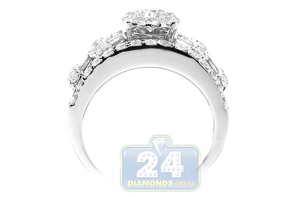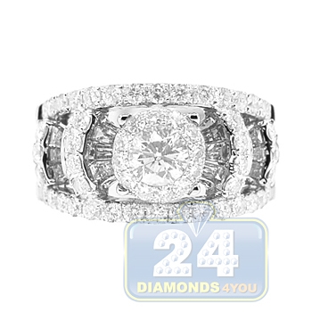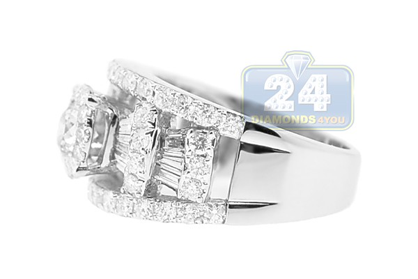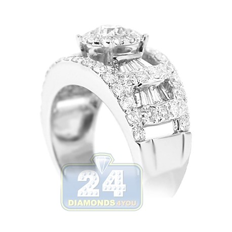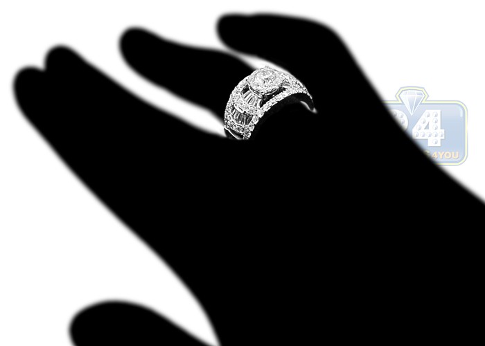 With this beautiful engagement diamond ring, you can show your true love to her. Crafted in cool 14k white gold with shiny polished finish, accented with round (1.67 ct) and baguette (0.51 ct) cut diamonds, our engagement ring features a gorgeous round cut center diamond surrounded by smaller stones. Luxurious design and shine of icy white and eye clean diamonds make up this amazing diamond treasure!