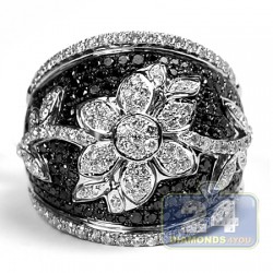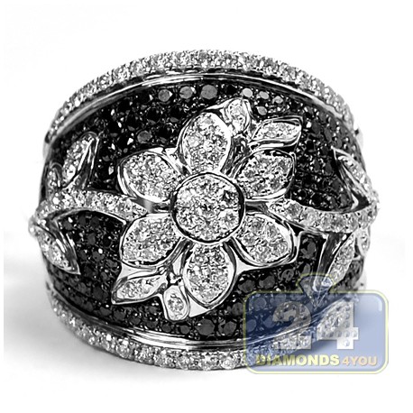 Our floral inspired ring is a real piece of art! It features the unique flower pattern designed in cool 14k white gold, finished with shiny polish, and skillfully encrusted with genuine black and white round cut diamonds weighting 2.36 carat. The stones are eye clean, with SI1-SI2 clarity and G-H color for the white ones. Perfectly mixed and contrasting diamonds make this ring truly bold, stylish and so special!