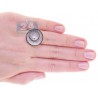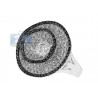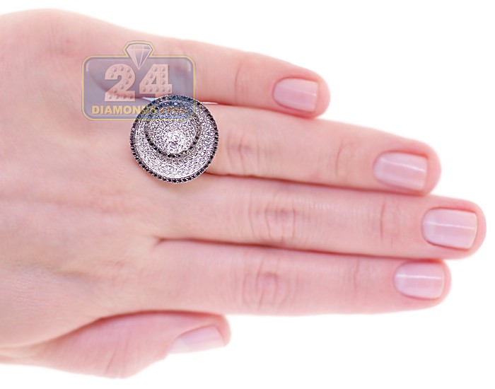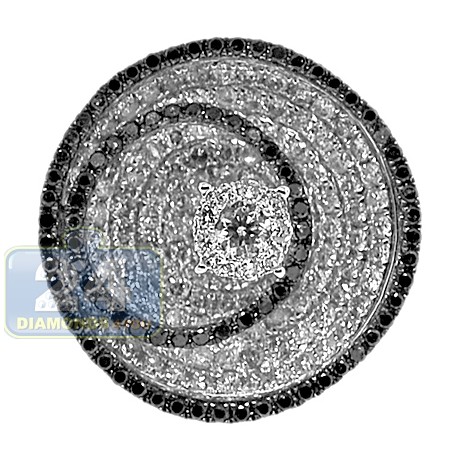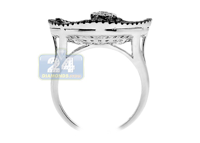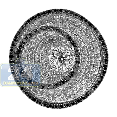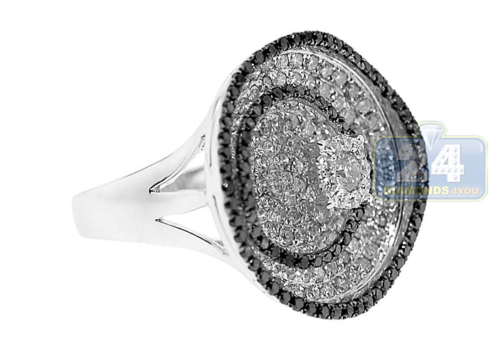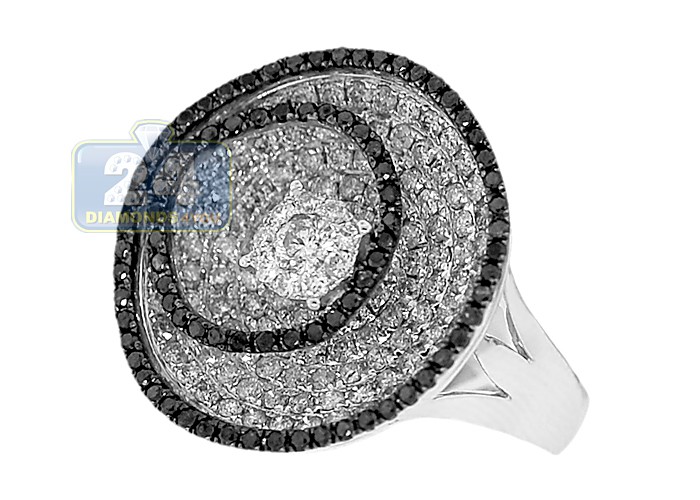 Gorgeously shaped, designed and color contrasted, our women's ring is so unique! It is handmade of cool 14k white gold with high polished, and beautifully encrusted with genuine white and black diamonds totaling 2.49 carat. The impressive abstract design accented by a solitaire diamond in the center surrounded by smaller stones on sides. Be ready to get a lot of compliments with this special jewelry piece!