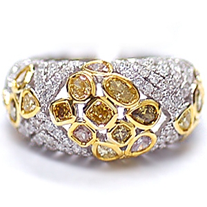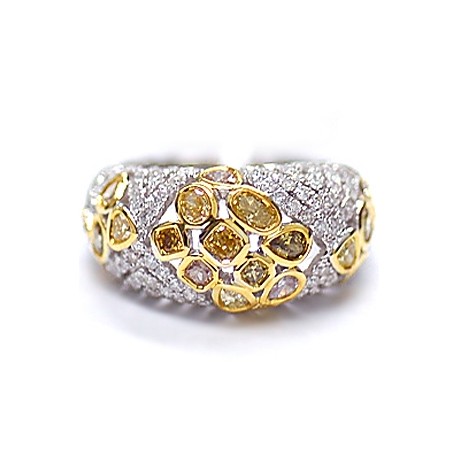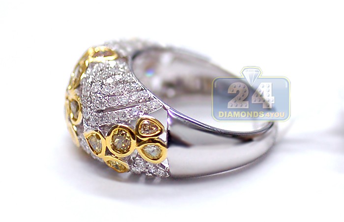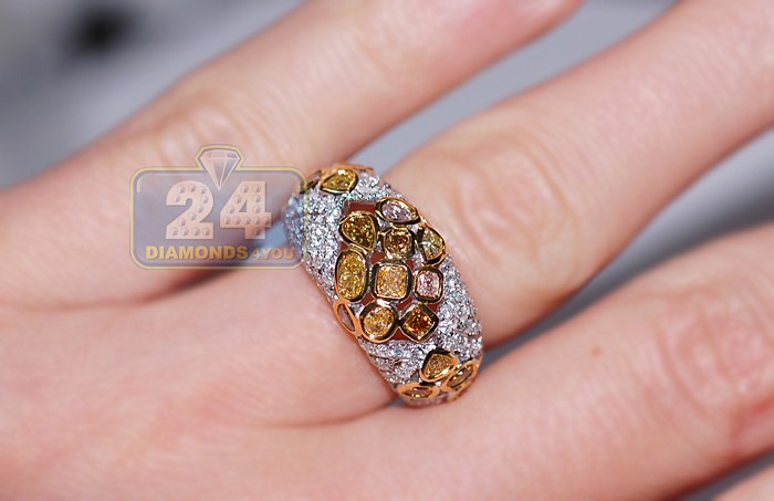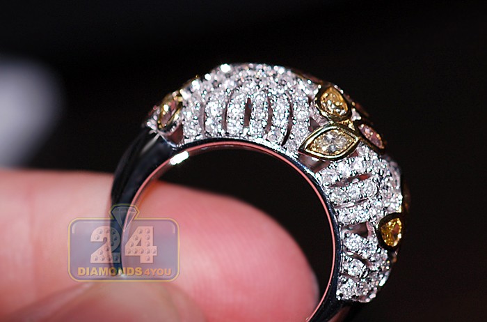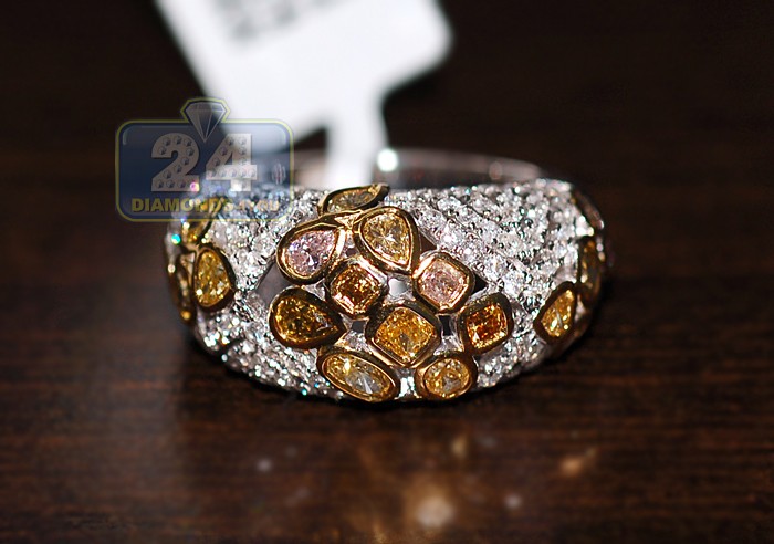 Charming fancy diamond ring is treasured as a symbol of everlasting love and perfection! This magnificent jewelry piece offers impressive combination of fancy yellow, brown, cognac & icy white diamonds. All eye-catching stones are weighting 2.55 carat. The jewel is artfully handmade of 14k white gold with high polished finish. Our gorgeous ring will make a lovely addition to your jewelry collection!