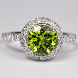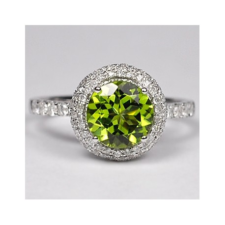 Our green peridot and white diamond ring is a stylish choice to flatter your everyday look! It's handmade of lustrous 14k white gold, and encrusted with gorgeous genuine peridot (2.04 ct) and icy white diamonds (0.74 ct). Express yourself wearing this beautiful gemstone ring!