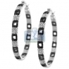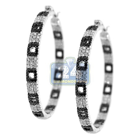 Alluring and ravishing, these two tone diamond studded hoop earrings impress at first sight! The pair features a special square pattern of mixed black and white round cut brilliants of the natural origin. Like all of jewelry, the earrings are professionally handcrafted in 14k white gold and finished with high polish to add a distinctive look and feel. The pair is accented with diamonds in and out and this makes these jewels extra chic. You can wear it daily with any formal and informal outfit. Secure closures and an outstanding luxurious look!