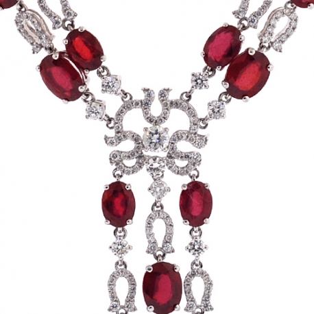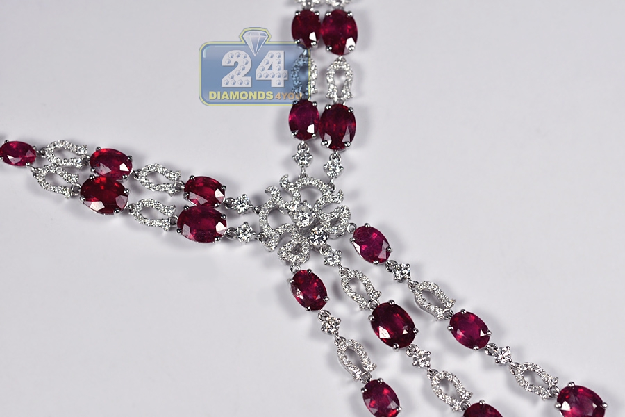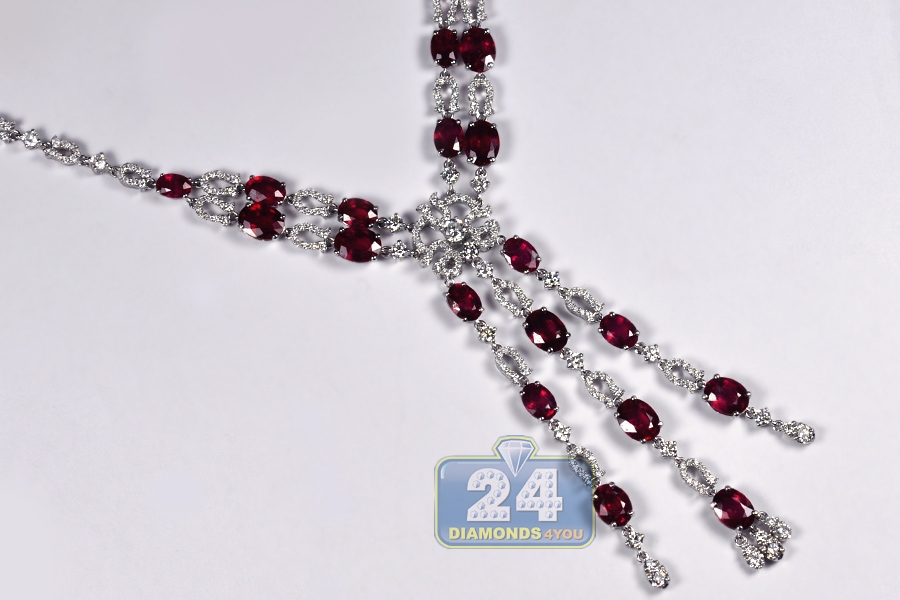 You're looking at something artfully sensational, our gemstone Y-shape necklace will wrap your neck in a sumptuous way! It's masterly made of cool 14k white gold, and polished to add ultra-smooth sparkling finish. This women's gemstone necklace is encrusted with rich oval-cut filled rubies of 25.42 carats. They're highlighted by icy white round brilliant-cut genuine diamonds, all totaling 3.60 carats. The piece of jewelry measures 16 inches in total length, and it has central dangling part of 2.75 inches. The endings are connected by a secure user-friendly box clasp. This Y shaped necklace for women will illuminate your ensemble with pure chic!