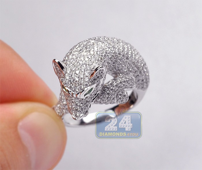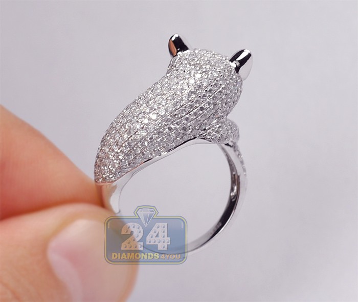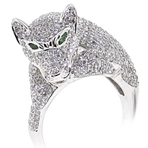 Beautiful and graceful like a real panther, our diamond ring is a stunning copy of the animal. It is artfully handmade of cool 14k white gold with perfectly polished finish, and amazed with 2.97 carats natural diamonds. Each brilliant is sparkling and eye clean, with SI1-SI2 color and G-H color. The cat's eyes are gorgeously encrusted with genuine green emeralds. What a gorgeous animal can be with you forever!