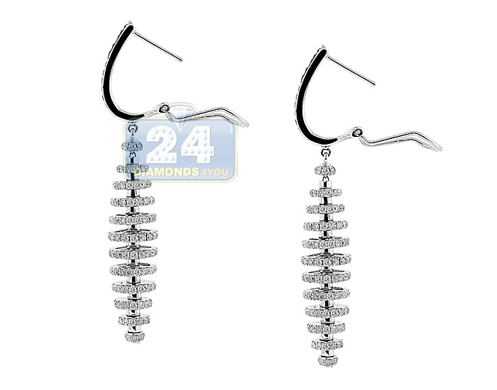 These women's drop earrings feature an enchanting and unique design shimmering with icy white round brilliant-cut diamonds of 2.99 carats (SI1-SI2 clarity, G-H color). Our diamond piece is ably created from cool 14 karat white gold, and high-polished for very smooth finish. These diamond dangle earrings measure 50 mm in height and 7 mm in width. They offer an exquisite sparkle to evening looks!