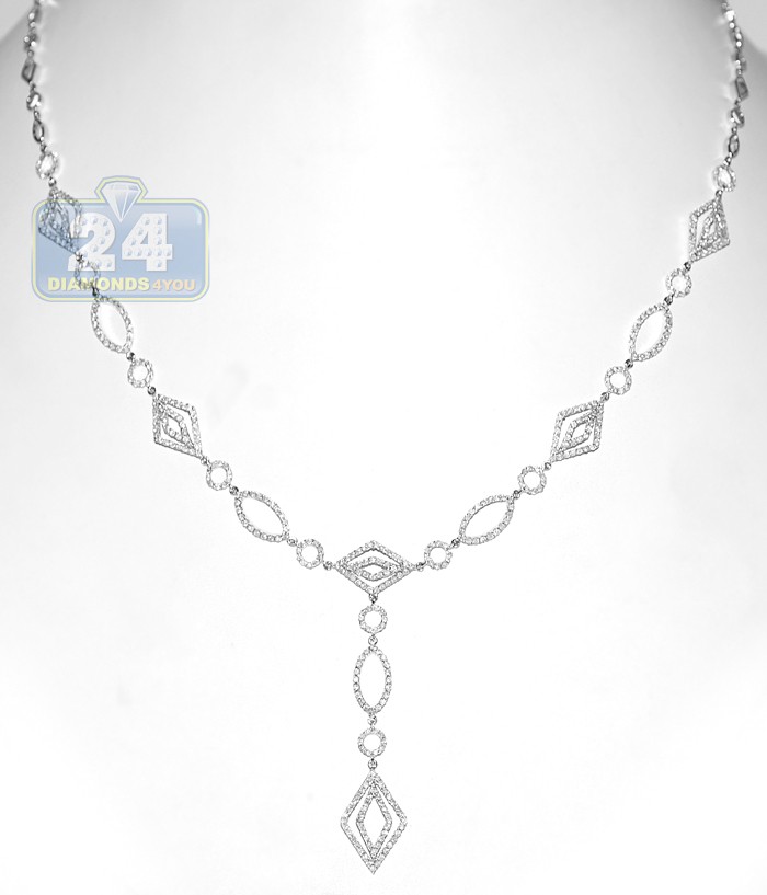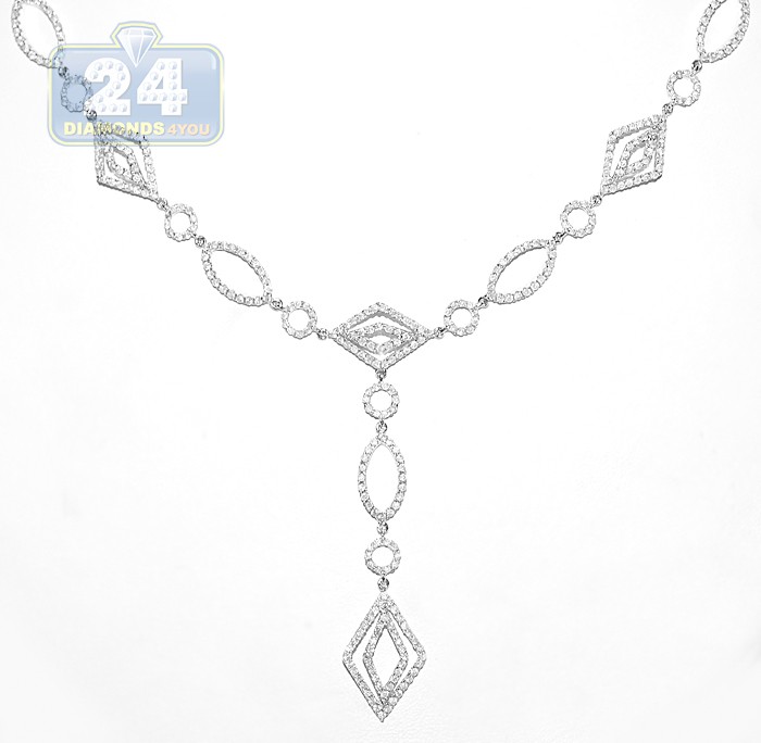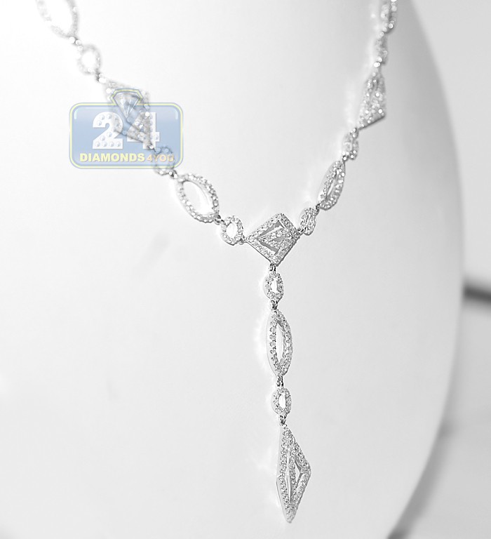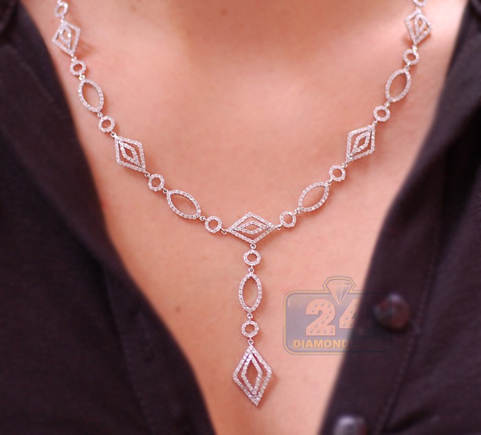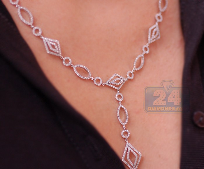 Our beautiful diamond Y shape necklace can be the best gift for your beloved one! The piece is smartly created from cool 14 karat white gold with highly polished smooth finish. The geometric necklace features rhombus, round and oval links that accented with shiny white round brilliant-cut real diamonds totaling 3.00 carats. The alternating pattern continues down from the center of the necklace to create a dangling piece to adorn your neck. This women's lariat necklace measures 9 mm in width of links, 18 inches in length with the dangling part of 2 inches. A magnificent addition to her dress for special occasions!