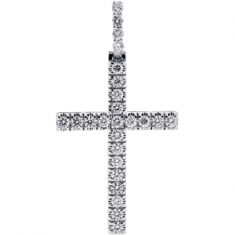 A classic symbol of hope and faith, our handsome diamond cross is a timeless piece! It's masterly made of cool 14k white gold with highly polished shiny finish. The jewelry is set with 3.11 carats of icy white round brilliant-cut natural diamonds. Total length is 63 mm, and the cross itself measures 50 x 33 mm. The bail perfectly fits a chain of up to 6 mm in thickness. This men's pendant makes a special religious statement!