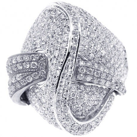 Looking for a piece of jewelry for the next big event?! Choose our diamond twisted ring, and all eyes will be on you! Professionally made of cool 14k white gold, it has highly polished smooth finish. It's also iced out with 3.18 carats of icy white round brilliant-cut genuine diamonds. Width of the top is 27 mm, and the shank is 5 mm. Designed in lovely swirl style, this women's ring celebrates sensational fusion!