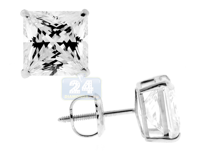 14K White Gold 3.90 ct Princess CZ Screw Back Stud Earrings