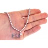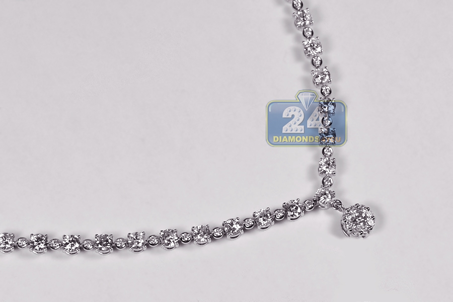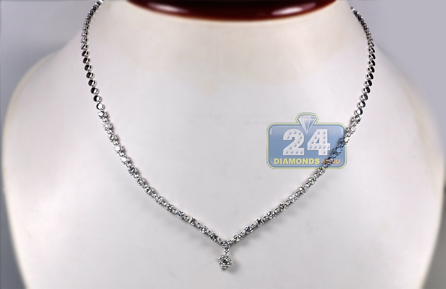 Our diamond drop necklace turns heads with its fabulous style! It's lovely handmade of cool 14 karat white gold, and polished for ultra shiny look. The lariat necklace is encrusted with 3.94 carats of lustrous white round brilliant-cut real diamonds, SI1-SI2 clarity and G-H color. Women's diamond necklace features 17 inches in length, and its varies from 3 to 6 mm. The piece is also secured by a safe box clasp. Make an unforgettable statement!