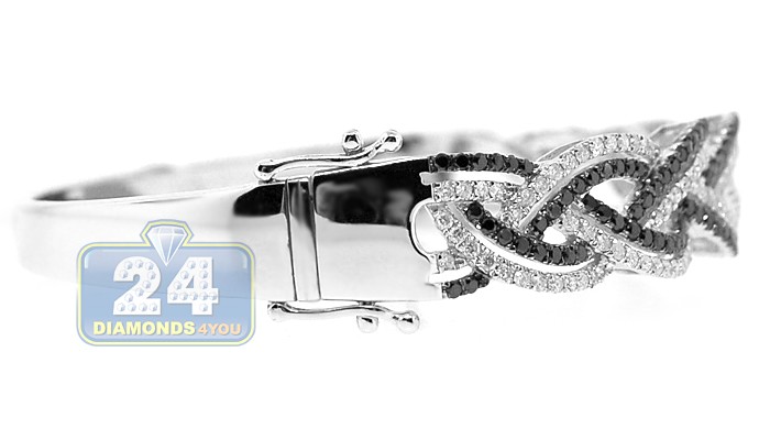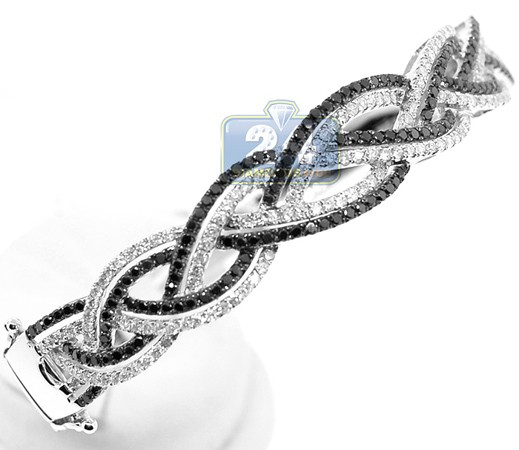 A river of diamonds shimmers through on our braided bangle bracelet! Artfully manufactured from cool 14 karat white gold, it's high-polished to add ultra shiny finish. This women's round bangle is studded with black and white round-cut natural diamonds, all weighing 3.10 carats. It measures 6.5 inches in inner length and 12 mm in width. This diamond bangle bracelet has a stunning look for any occasion!