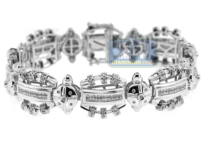 Here's a classic diamond link bracelet for him that's so versatile, he'll wear it all year through! The piece of jewelry is ably crafted in gleaming 14k white gold with high-polished smooth finish. Our men's diamond bracelet has 3.13 carats of icy white round and princess-cut diamonds. Its length is 8 inches and width - 15 mm. This diamond link bracelet will add an air of distinction and ruggedness to the wardrobe of any man who values his appearance!