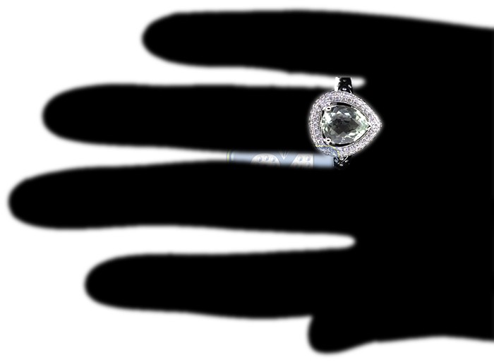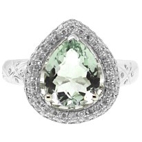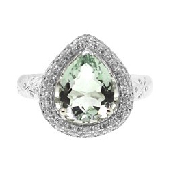 Go green! This beautiful gemstone cocktail ring is specially created for jewelry lovers! The ring is artfully handmade of cool 14k white gold with perfectly polished finish, and skillfully encrusted with a genuine green pear shaped amethyst in the center. This impressive gem is stylishly surrounded by naturally sparkling and eye clean round cut diamonds totaling 0.50 carat.