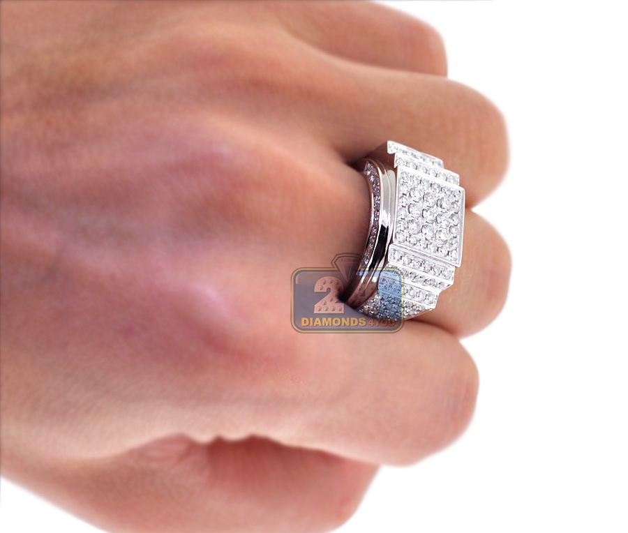 You are looking at the stylish men's ring with a special step shaped design! It is professionally handcrafted from lustrous 14k white gold with high polished finish, and expertly set with icy white round cut diamonds totaling 3.23 carat. All brilliants are high quality, sparkling and eye clean, with F-G color and SI1-SI2 clarity. This is a really handsome and eye catching accessory for the modern man!