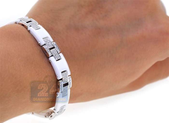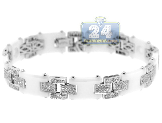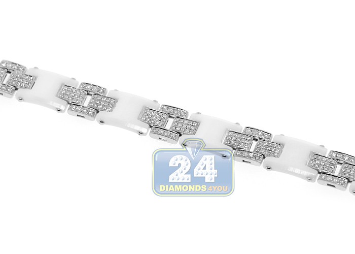 This men's diamond bracelet showcases an amazing combination of cool 14 karat white gold and white ceramics. The links are encrusted with 3.25 carats of icy white round brilliant-cut genuine diamonds. It also measures 8.5 inches in length, 11 mm in width, and secured by user-friendly fold-over clasp. This diamond ceramic bracelet is masculine and modern with a sporty style, for the guy who makes a distinct impression!