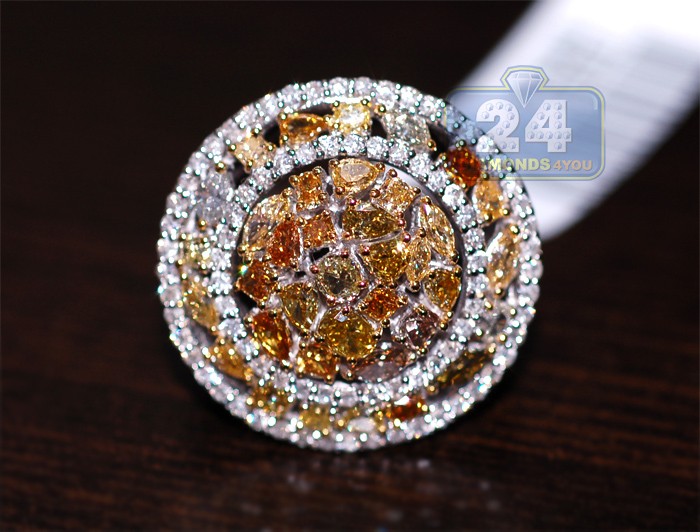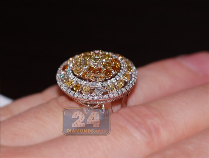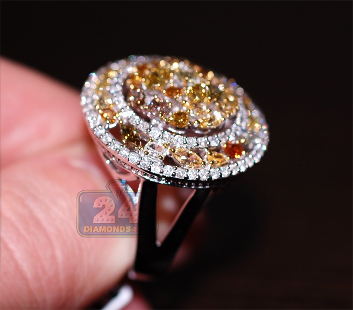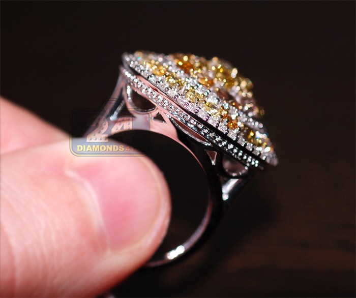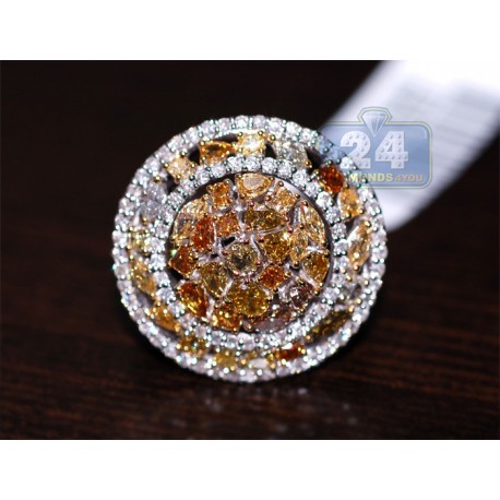 Simply luxurious and sophisticated! This impressive cocktail ring with plenty of genuine oval, round and pear cut fancy multicolored diamonds totaling 3.42 carat is a real work of art! It is masterly handmade of cool 14k white gold with perfectly polished finish. Draw everyone's attention to your lovely fingers with such an unique jewelry piece!