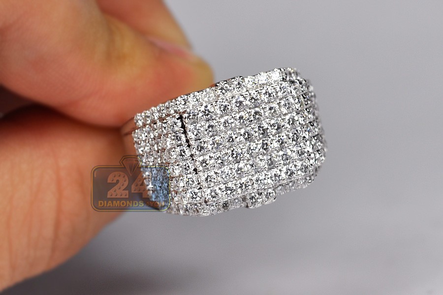 Truly masculine and handsome! Our statement ring is expertly handmade of cool 14k white gold, has shiny polished finish, and gorgeously accented with icy white round brilliant-cut diamonds totaling 3.44 carats. This impressive jewelry piece coordinates perfectly with both business and casual attire!