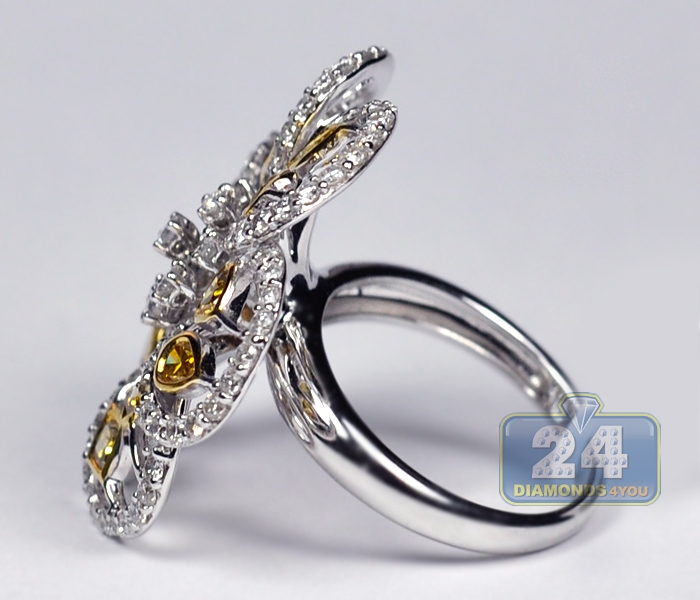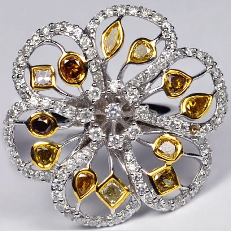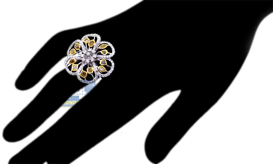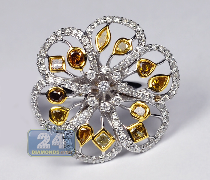 Unique and extraordinary in design, this one of a kind ring is masterly handcrafted in lustrous 14k white gold with perfectly polished finish, and features a beautiful flower design covered with shimmering diamonds showcasing plenty of natural fancy yellow, cognac and classic icy white diamonds. These fancy colored stones are presented in various shadows and shapes. What a wonderful gift for someone special!